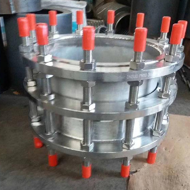 雙法蘭限位伸縮接頭在管道運(yùn)行中有一定的多向位移作用,對(duì)管道在運(yùn)行中由于熱漲冷縮、地殼下陷和受力產(chǎn)生著重要的伸縮補(bǔ)償作用,因此,伸縮接頭可以緩解管道運(yùn)行中的盲板推力,對(duì)管道起到一定的保護(hù),特別是對(duì)管道的安裝和維修提供了極大的便利。但是,在水泵出口處和管道轉(zhuǎn)角處,在無固定支墩、無限位支墩和定向限位支墩支架的滑動(dòng)管道連接中應(yīng)采用傳力接頭和限位傳力接頭,或采用限位伸縮器和防拉脫限位橡膠接頭,以及可采用限位伸縮接頭及卡箍柔性接頭,因?yàn)閭髁宇^通過傳力螺栓(即全絲螺栓)能把啟泵時(shí)的盲板推力傳導(dǎo)到泵和管道各部位,避免推力集中于管道轉(zhuǎn)角處或泵的近端,發(fā)生沖擊力損傷設(shè)備。